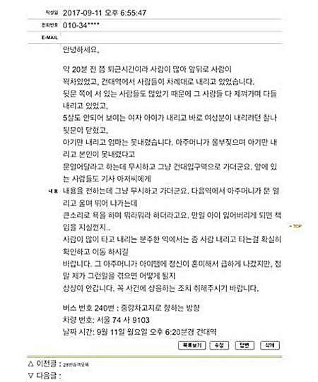 앞서 이번 논란은 서울시버스운송사업조합 홈페이지에 ‘240번 버스가 11일 오후 운행 중 한 어린아이가 내린 상태에서 아이 어머니의 내려달라는 다급한 요청에도 그대로 출발했다’는 내용의 글이 게시되면서 불거졌다.