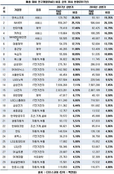 [일요주간=조무정 기자]올해 상반기 매출 대비 연구개발(R&D)에 투자를 가장 많이 한 기업은 게임업체인 엔씨소프트로 조사됐다.