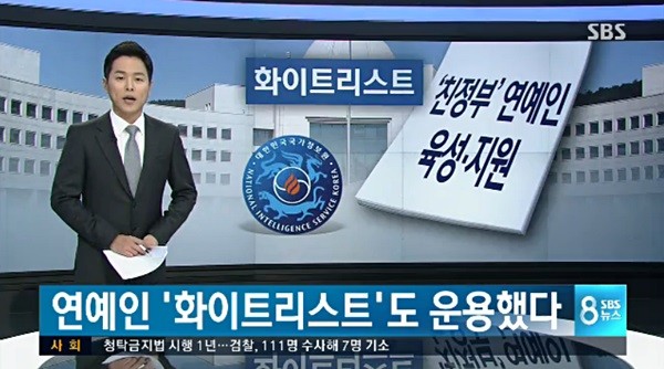 20일 SBS는 “이명박 정부 당시 국정원이 문화계 블랙리스트를 운용하고 이들의 활동을 제재한 것으로 알려진 가운데, 반대로 친정부 성향의 연예인들을 집중 지원하는 이른바 화이트리스트도 있었다”고 보도했다.