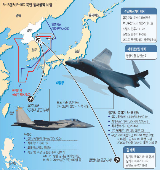 이렇게 북한 핵·미사일 위협이 고조되자 한·미 양국은 최근 B-1B를 적어도 한 달에 두 차례씩 정례적으로 한반도에 전개시키기로 했다. 군 관계자는 24일 “B-1B가 이번 달 두 번 한반도에 출격했다”며 “앞으로 출격 횟수가 늘거나 다른 전략자산들의 한반도 전개가 잦아질 수 있다”고 말했다.