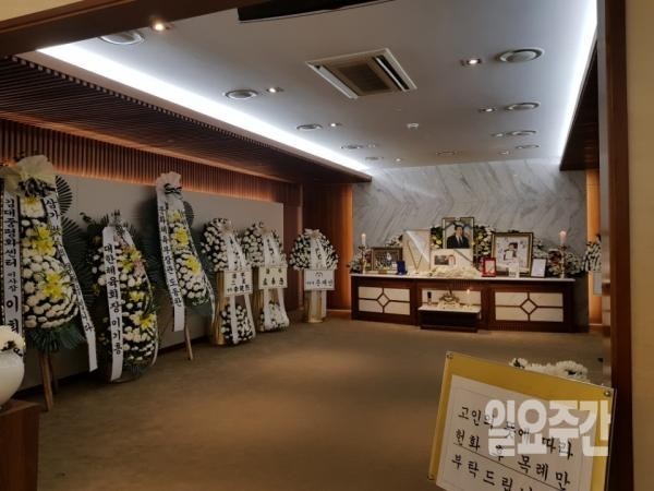 ▲ 김운용 전 부위원장의 빈소에는 손주 세웅씨와 사위 오창희 세방여행사 부회장이 조문객을 맞이하고 있다. (10월 7일 연세대 세브란스병원 장례식장)