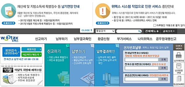 그러나 오는 14일 0시부터 15일 17시까지 위택스 홈페이지가 시스템 작업으로 인해 서비스가 중단된다. 이 기간에는 위택스 홈페이지 및 스마트위택스, CD/ATM, 인터넷지로, 인터넷뱅킹 등 지방세(세외수입포함) 조회/납부 서비스 등 전체 서비스를 이용할 수 없다.