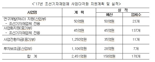 국회 산업통상자원위원회 소속 김도읍(자유한국당)의원이 산업통상자원부로부터 제출받은 자료에 따르면 산업통상자원부는 올초 조선기자재 업체의 사업다각화를 위해 2451억원을 집중 지원하기로 했지만 실제 집행된 예산은 계획대비 6.4%인 158억원에 불과했다.