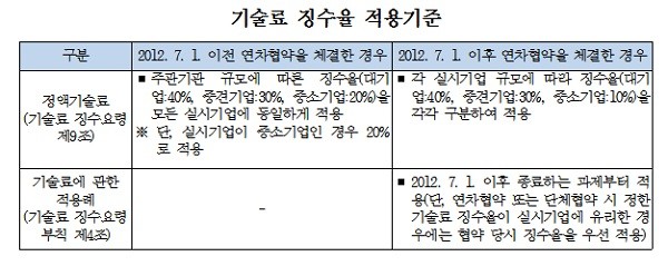 개정된 기술료 징수요령 제9조의 규정에 따라 산기평과 KIAT는 2012년 7월 1일 이후 종료되는 연구개발 과제에 대해 기술료를 징수할 때에는 개정된 기술료 징수요령에 따라 각 실시기업의 규모에 따른 기술료 징수율을 적용하다. 개정 이전 체결된 연차협약에서 주관기관 기준으로 산정한 기술료 징수율이 실시기업에 유리하면 해당 연차에 대해서는 협약 당시 정한 기술료 징수율을 적용해야 한다.