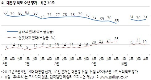 한국갤럽이 10월 넷째 주(24~26일) 전국 성인 1006명에게 물은 결과, 대통령 직무 긍정율은 지난주 보다 3%포인트 오른 73%였다. 부정적인 평가는 4%포인트 하락한 19%, 모름·응답거절은 5%다.