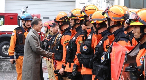 또 “지금 화재 진압과 구급·구조 임무를 맡은 현장 인력은 법이 정한 기준에 비해 1만9000여 명이나 부족하다”며 “정부는 올해 1500명을 시작으로 2022년까지 부족한 소방인력을 차질 없이 확충할 계획”이라고 전했다.