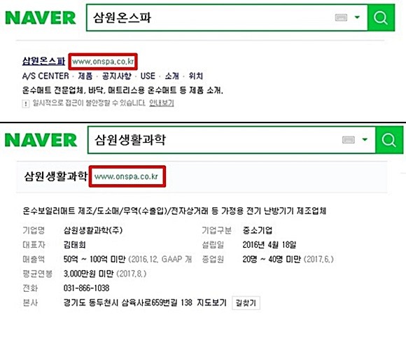 이에 더해 인터넷 상에 ‘삼원생활과학’ 이라고 검색할 경우 연결되는 사이트가 ‘삼원온스파’의 사이트 주소와 동일한 것도 그 의문을 더했다.