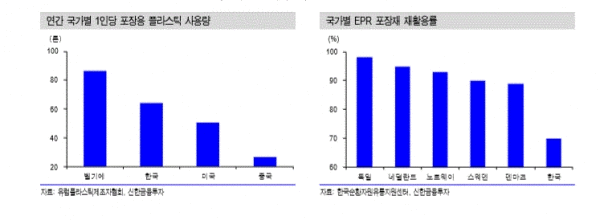 신한금융투자는 10일 최근 논란이 일고 있는 국내 폐플라스틱 대란과 관련 ‘중국의 역풍: 플라스틱 그리고 미세먼지’라는 제목의 리포트에서 “환경부는 EPR1)(생산자 책임 재활용) 지원금을 조기 지급하고 재활용 잔재물을 처리 비용이 낮은 생활폐기물로 분류 되도록 규정을 개선했다. 재활용 업체는 폐플라스틱 수거를 재개했지만 근본적인 대책에 이르지 못했다”며 “한국의 1인당 연간 포장용 플라 스틱 사용량은 64.1kg로 벨기에에 이어 세계 2위다. 1인 가구 증가에 따른 소포장 증가와 택배 발송량 증가가 폐플라스틱 발생을 가속시키고 있다”고 분석했다.