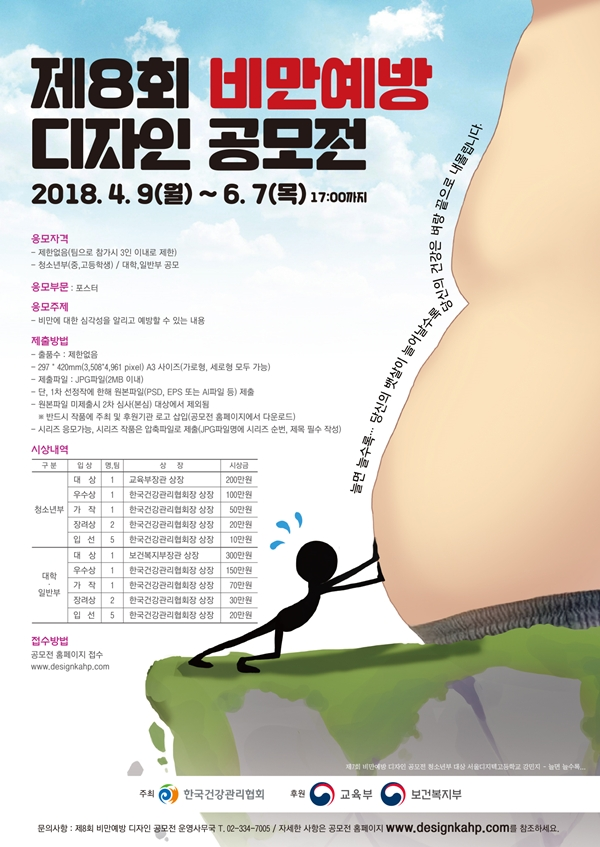 [일요주간 = 소정현 기자] 한국건강관리협회가 주최하고 교육부와 보건복지부가 후원하는 ‘제8회 비만예방 디자인 공모전’ 오는 9일부터 6월 7일까지 개최된다.