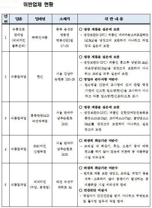 이외에 혜인식품(네네치킨 물류센터), 한신, 홍콩반점이 냉장보관 제품들을 냉장고에 보관하지 않고 실온에 보관하다 적발됐다.