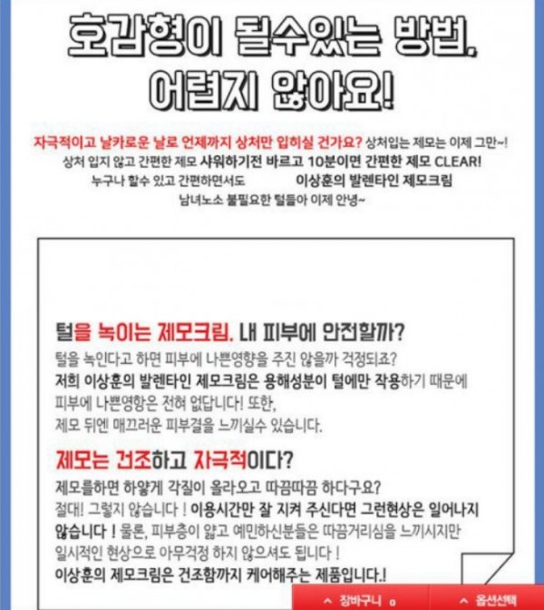 취재 결과 해당 제품은 개그맨 이상훈씨가 광고 모델로 나오는 '이상훈의 발렌타인 제모크림'인 것으로 확인됐다. 이 제품은 위메프에서 판매되고 있는데 제품설명에서 '의약외품'이란 문구가 버젓이 사용되고 있는 것으로 확인됐다. <일요주간>이 취재에 들어가자 위메프 측은 일부 해당 제품 소개란에서 '의약외품' 문구를 삭제했지만 여전히 상당수 같은 제품에서는 '의약외품'이 표시된 채 불법광고로 판매되고 있다.