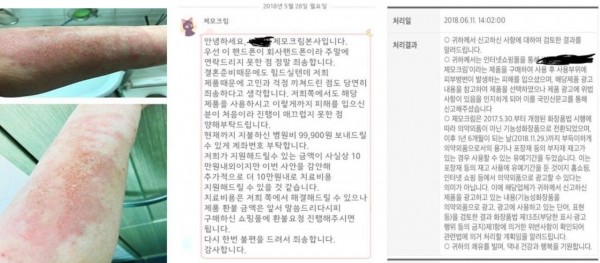 A씨는 "인터넷 쇼핑몰에서 의약외품이며 식약청에 허가를 받은 안전하고 순한 크림이라는 광고문구를 보고 제모크림을 구입해 큰 낭패를 봤다"며 "사용 후 화학적 화상을 입고 피부 병변이 발생하는 심각한 피해를 입었다"고 주장했다.