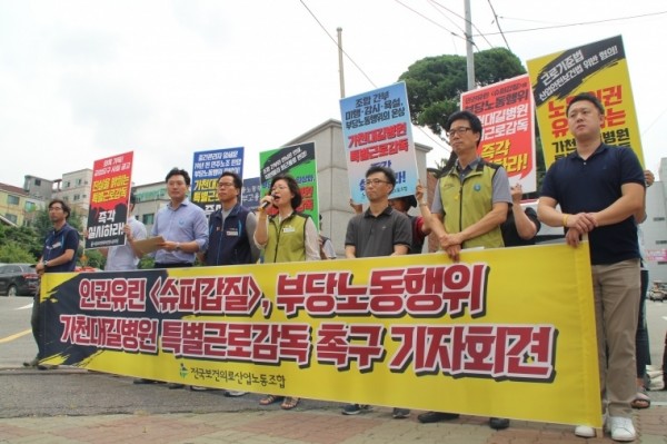 보건의료노조는 이날 기자회견문을 통해 “가천대길병원의 민주노조 파괴는 부당노동행위에 해당하는 범죄일뿐만 아니라 수퍼 갑질의 출발점”이라며 “정부는 노동존중사회 실현을 위해 노조가입을 방해하는 행위에 대해 처벌을 강화하겠다고 발표했다. 이에 가천대길병원의 부당노동행위에 대해 철저한 특별근로감독을 요청한다”고 수사를 촉구했다.