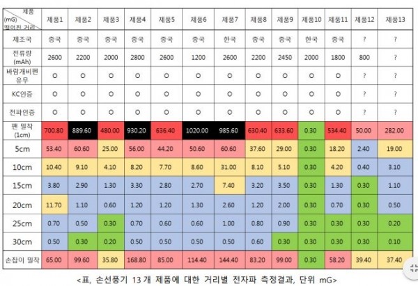 측정결과 사용자가 손 선풍기를 얼굴이나 목, 머리에 바짝 대고 사용하는 경우 최저 50mG에서 최고 1020mG의 전자파로 평균 647.7mG의 전자파를 만들어내는 것으로 관측됐다.