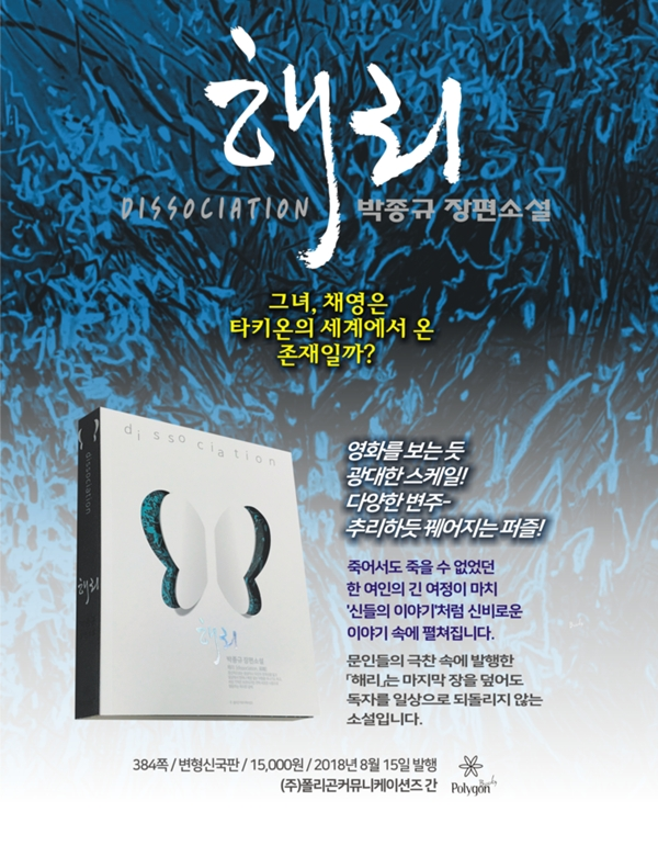 이 책은 아직도 진정한 광복이 오지 않았다고 생각하는 해외 거주 한인들에게는 극일의 메시지가 될 것이다. 작가는 이를 염두, 책의 발간일도 8월 15일 광복절로 맞췄다. 장편소설 해리는 해리성 둔주라는 특이 증상을 캐릭터에 차용, 초월적인 존재가 일으키는 신비로운 이야기를 개연성 있게 추적한다.