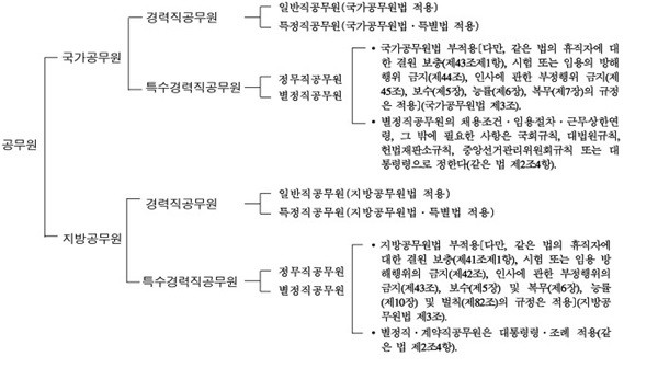 「국가공무원법」과 「지방공무원법」은 공무원의 직을 경력직과 특수경력직으로 구분한다. 다시 경력직을 일반직과 특정직으로, 특수경력직을 정무직과 별정직으로 구분하고 있다(국가공무원법 제2조, 지방공무원법 제2조). 「국가공무원법」과 「지방공무원법」은 원칙으로 경력직 중 일반직 공무원의 근무법이며, 특정직 공무원에 관하여는 각 특별법이 적용된다(예 : 외무공무원법 · 소방공무원법 · 경찰공무원법 · 교육공무원법 · 군인사법 · 군무원인사법 등).