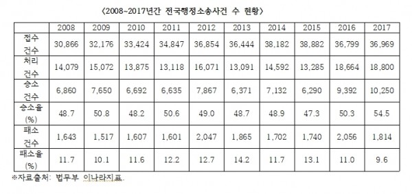 행정소송의 승소율은 2007년 이래 증가추세 이후 등락을 반복하고 있으며 2017년도에는 전년도에 비해 4.2%p 증가한 것으로 나타났다. 행정소송 패소율은 2007년 이래 감소추세 이후 등락을 반복하고 있으며 2017년도에는 전년도에 비해 1.4%p 감소한 것으로 조사됐다.