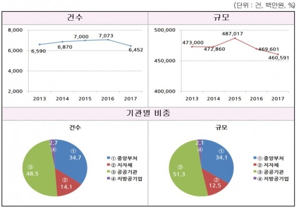 권익위가 781개 기관(중앙행정기관 59개, 지방자치단체 243개, 공공기관 330개, 지방공기업 149개) 대상으로 실태조사 한 결과에 따르면 최근 5년간 공공부문에서 추진된 정책연구용역은 총 3만3985건으로 규모는 약 2조3631억원에 이른다.
