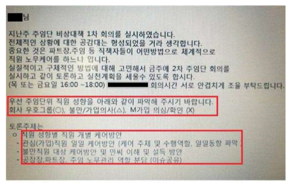 또한 포스코 노조 설립 이슈가 확장된 시기에 사측이 주임단 비상대책회의를 열어 직원들의 성향을 노조 가입에 대한 관심으로 분류해 이들에 대한 밀착 관리 방안을 강구했다는 것. 즉 각 직책자들이 역할을 분담해 노조 가입자에게는 지속적으로 탈퇴 종용을, 미가입 직원에게는 노조가입을 막도록 조직적으로 계획했다는 내용이다.