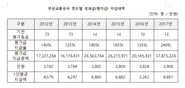 매년 적자를 내고 있는 부산지하철이 무슨 성과를 냈다고 부산교통공사는 성과급을 지급하는지 도무지 이해할 수가 없다. 거기다 부산교통공사는 2017년 평균임금이 75,800,000원으로 전국 지방교통공사 가운데 가장 높은 것으로 알려지고 있다.