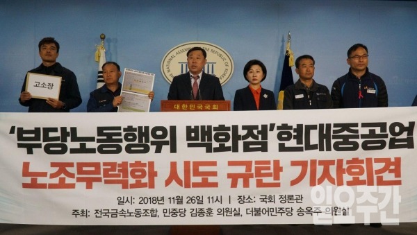 민중당 소속의 김종훈, 송옥주 의원은 민주노총 금속노조(현대중공업지부)와 함께 26일 오전 11시 국회 정론관에서 현대중공업 부당노동행위 관련 기자회견을 개최하고 이 같이 밝혔다.