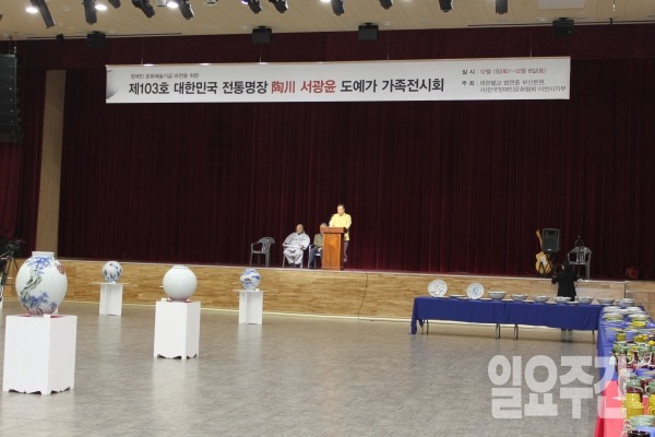 [일요주간 = 김쌍주 대기자] 대한불교 법연원(회주 조연스님)과 (사)한국장애인문화협회(중앙회장 안중원)가 주최하고 월간 나눔과 문화, 서광윤 도요, 다눔 갤러리, 느티나무 주관 하에 지난 1일 오후 3시 주최·주관·후원·협찬 측 관계자 등 100여명이 참석한 가운데 대한불교 법연종 부산본원 3층 문화홀에서 ‘장애인문화예술기금마련을 위한 제103호 대한민국 전통명장 도천 서광윤 도예가 가족전시회’가 열리고 있다.