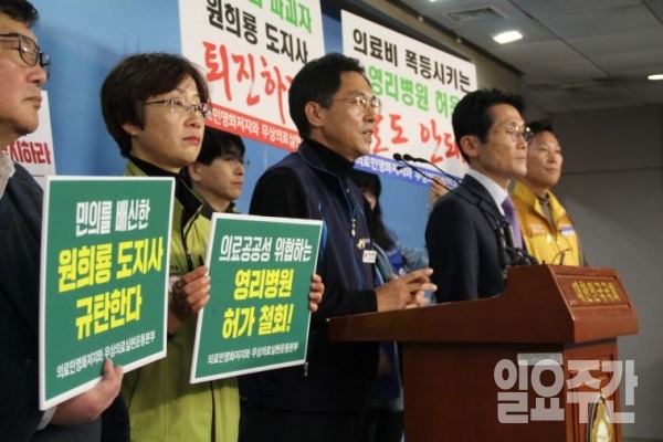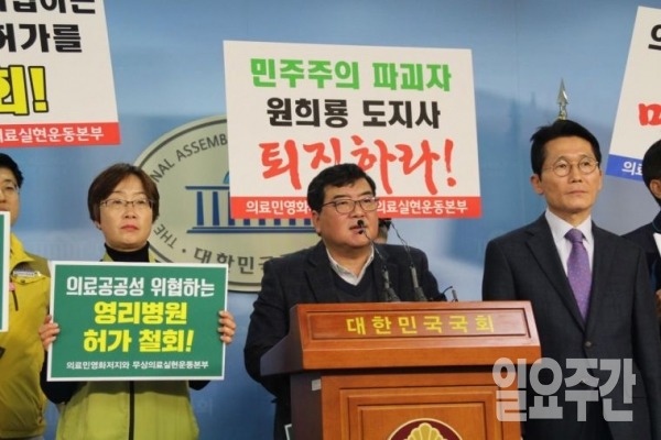 [일요주간=조무정 기자] 지난 5일 원희룡 제주도지사가 영리병원인 녹지국제병원을 허가한 이후 시민단체와 대한의사협회 등이 강력 반발하는 등 파문이 커지고 있는 가운데 시민단체인 무상의료본부는 지난 6일 국회정론관에서 기자회견을 열고 "지난 10월 4일 숙의형 ‘'공론조사위원회'의 녹지국제병원 불허 권고를 뒤집은 반민주적 폭거다"며 "자신이 수용한 민주적 절차를 통한 결정을 무시한 원희룡은 지사 자격이 없다"면서 원 지사의 퇴진 투쟁에 나섰다.