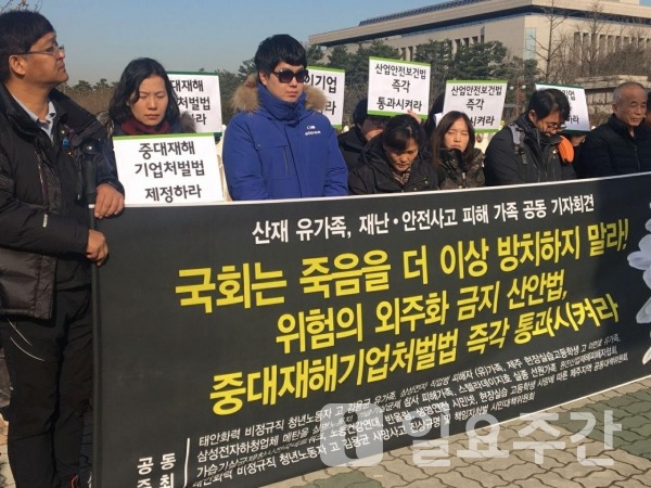 그러면서 "산업재해로 가족을 잃은 유가족과 산재 피해가족, 재난과 안전사고로 다치고 돌아가신 피해자의 가족들이 이러한 일을 방치해 온 국회를 규탄한다"면서 위험의 외주화를 막을 산업안전법과 중대재해 예방을 위한 중대재해기업처벌법 즉각 통과를 요구했다.