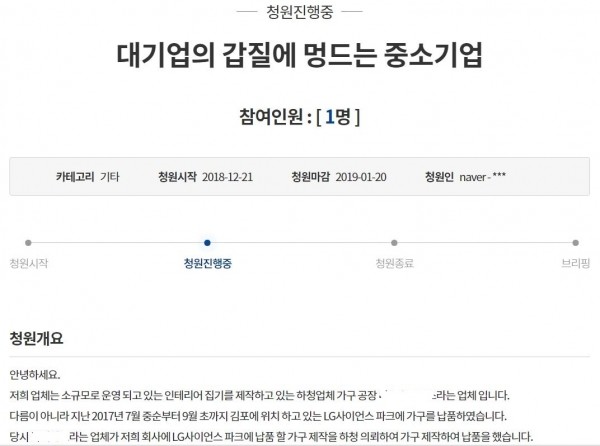 가구업체 B사 김모 대표는 이날 올린 청원글에서 "인테리어 집기를 제작하고 있는 소규모의 하청업체 가구 공장이다"고 소개하고, "지난 2017년 7월 중순부터 9월 초까지 김포에 위치 하고 있는 LG사이언스 파크(마곡)에 가구를 납품했다. 당시 A사가 저희 회사에 LG사이언스 파크에 납품 할 가구 제작을 하청 의뢰해 가구를 납품했다"고 밝혔다.