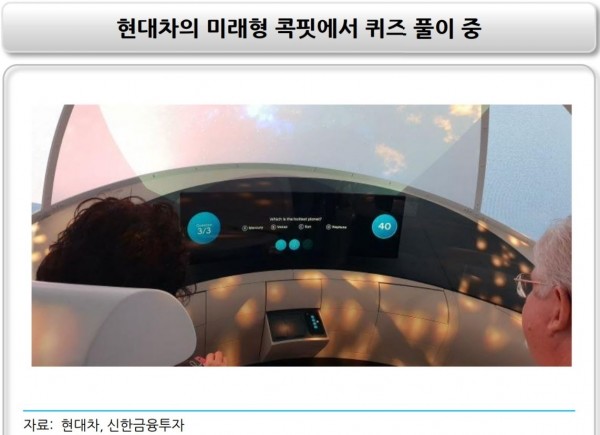 정용진 신한금융투자 연구원은 14일 ‘자동차가 본 CES 2019 - Car To Life’라는 제목의 리포트에서 “(주요 완성차 업체들이) 파일럿 기술의 구현보다 자동차 생활의 변화를 암시하는데 집중했다”며 “5G와 AI 등 2019 CES의 주요 쟁점들이 자동차에 반영됐다”고 분석했다.
